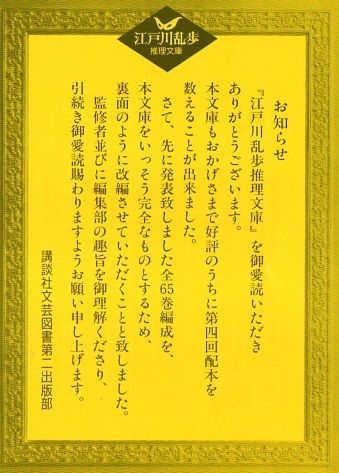 半年ほど前にも河出書房新社から黒岩涙香著、江戸川乱歩訳「死美人」というものが刊行されましたが、このときは乱歩本人の著作ではない旨がどこにも記載されておらず、物議を醸しました。今回の「名義訳」という謳い文句は、異様な雰囲気は受けるものの、まあ律儀な対応ではあると言えます。(なお、この「江戸川乱歩名義訳」というのは、著作者名ではなく書名の一部という扱いになっています)